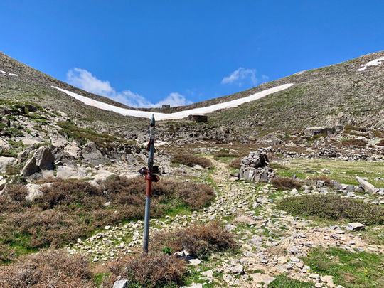 Next morning sun emerged from Psiloritis, hint received to get up and pack... indeed we did. Eastbound with continuous ups and downs that made us suffer in the summer heat. It was on;y 5pm that we eventually passed circumnavigating Koutalas ridge in favour of Akrotirianos 2070 and Mikros Trocharis 2105 to Askyfiotikos Soros col. Decision granted, too early but too tired. Hiking gets tiring in the bare alpine desert... this is where we spent the night. Wise enough of a decision it was, the notorious narrow passage of Sideroporti pass was there for us!