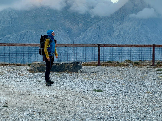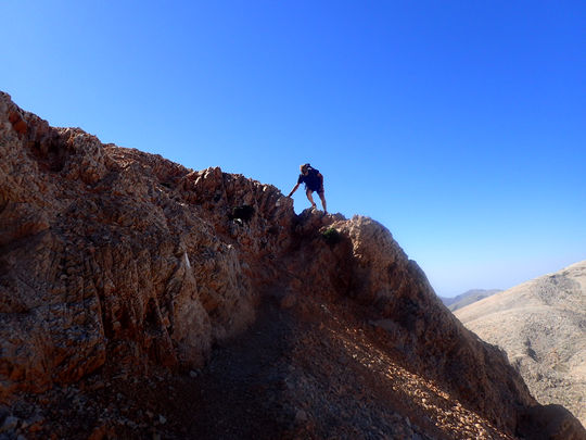 Early rise with not much water left in our canisters we hit the trail before the sun came up. Narrow deep and badly signed before we climbed the Sideroporti rocks and the stone slides before and after.