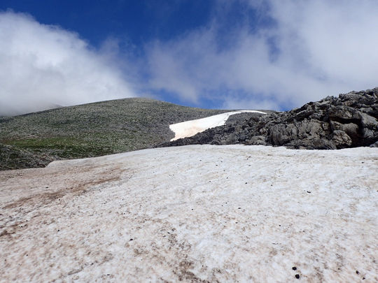The summits of Grias Soros 2331 appearded to the left and that of Agio Pnevma 2262 to the right. No courage to ascend Agio Pnevma with its stupendous views, as we had heard. We pursued instead ahead towards the badly needed fresh water.
